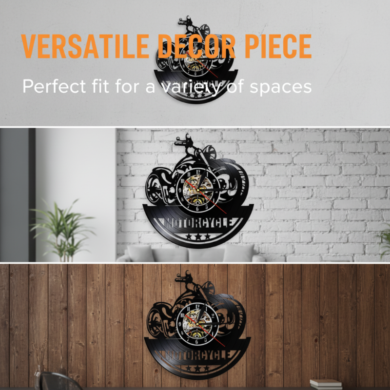 VINTAGE VINYL ART - Crafted from a genuine vinyl record and a motorcycle silhouette, this clock infuses your space with a cool, retro vibe. Its unique design is a guaranteed conversation starter, blending nostalgia with modern wall art.